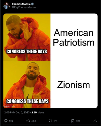 So why isn't that the relevant explanatory context? Yes, Massie is an isolationist, but there's a long history of paleo-conservative isolationists guzzling antisemitic broth, and Massie seems clearly to be of that ilk. Yet for some reason, the instinct is to elide that history -- no, worse, to actively obscure it. One could defend doing with him what JTA did with his three colleagues -- simply noting their votes without elaboration. But if one is going to single Massie out and say "this guy needs more context", it is absurd to offer a framing that is predominantly exculpatory to the guy who once tweeted about pitting "Zionism" against "American patriotism".